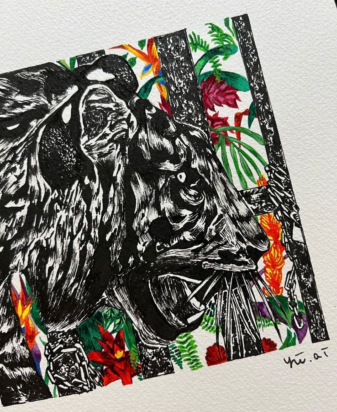 人間に囚われた虎はもう二度と花に触れることも出来ない。鮮やかに咲き続ける花を対照に、色彩を奪われた虎を描きました。